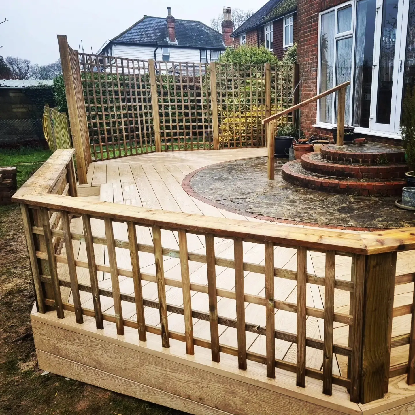 This project required absolute accuracy and attention to detail. The existing patio featured curved edges and varying angles, meaning every decking board needed to be measured, cut, and aligned perfectly to achieve a seamless fit.