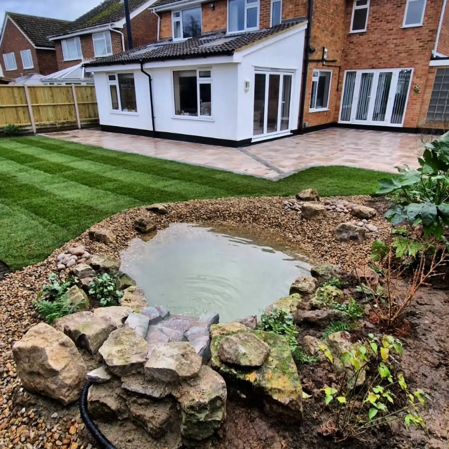 A full garden renovation like this typically takes around two to three weeks, including clearing the existing garden, installing drainage, constructing the patio and ponds, planting, and laying new turf.