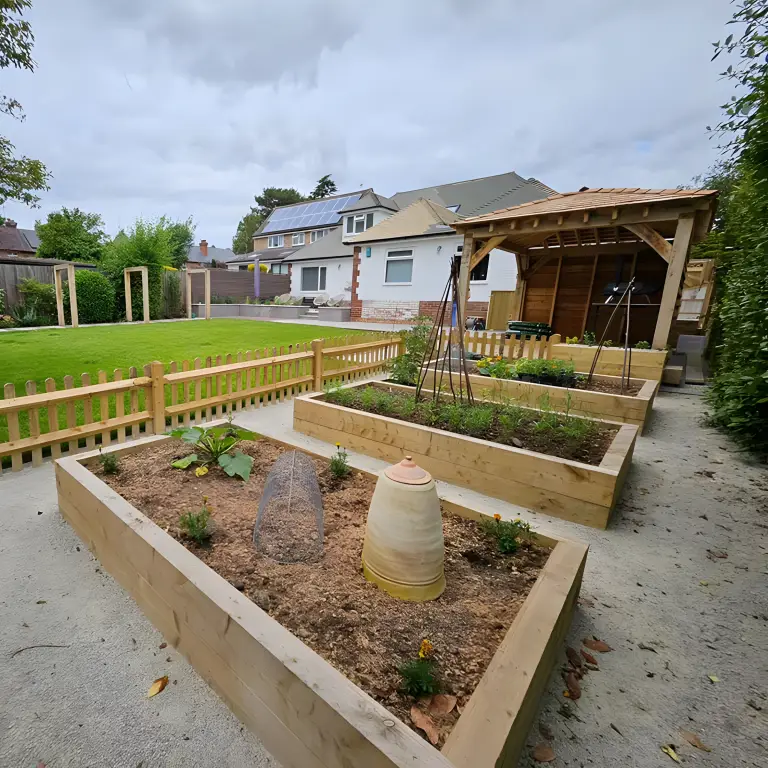 The addition of raised timber sleeper beds provides a dedicated space for herbs, vegetables, and flowers, making it easy for the homeowners to grow their own produce.