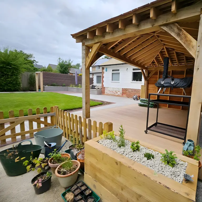 This beautiful garden transformation in Bearsted was designed to provide a versatile outdoor space for entertaining, relaxing, and growing fresh produce. The project included a sleek porcelain patio, composite decking, an outdoor kitchen, and a carefully planned planting scheme. The result is a stunning, functional garden that blends modern style with natural beauty.