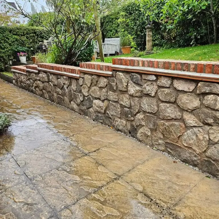 - Brick detailing: The wall was finished with red brick copings and soldier courses, adding crisp lines and definition. This not only improves durability but also frames the stone beautifully.