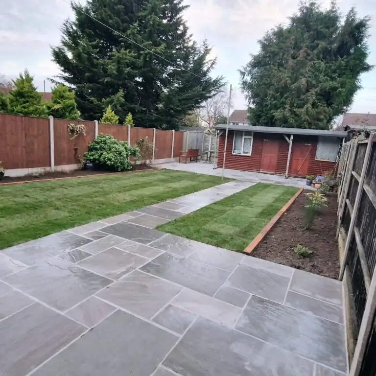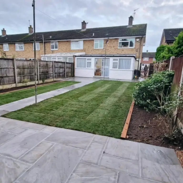 A full garden refresh for a Maidstone property – combining crisp new sandstone paving, a freshly laid lawn, and neat planted borders to create a modern, usable space. Once the fencing and outbuilding are painted in dark grey, this garden will look effortlessly cohesive and contemporary.