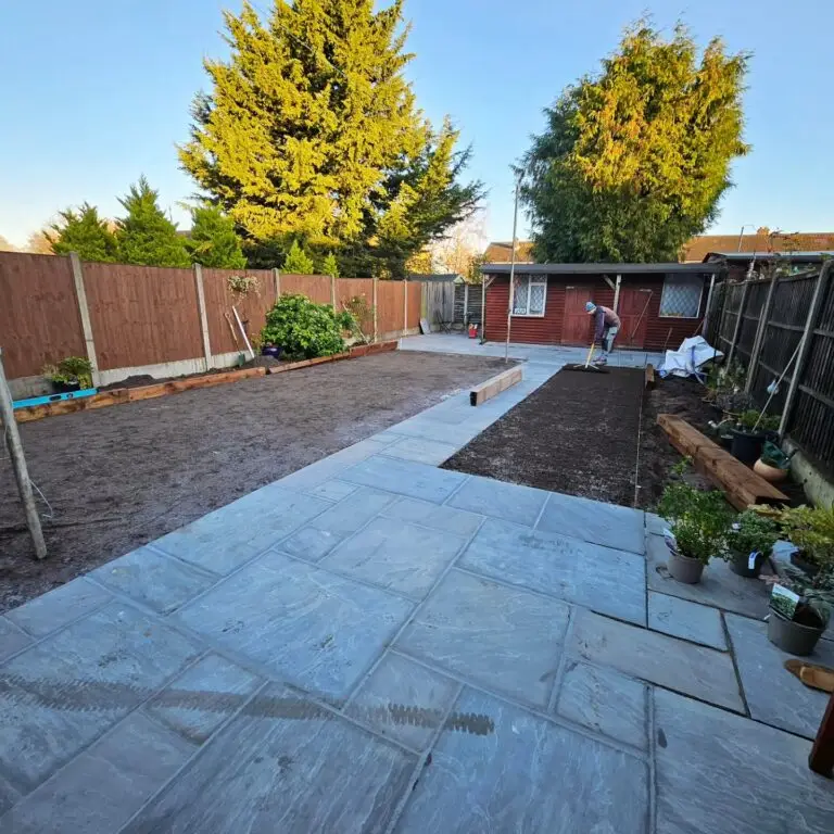A full garden renovation like this typically takes around two weeks from start to finish, including ground preparation, drainage installation, excavation, laying paving and finishing touches.