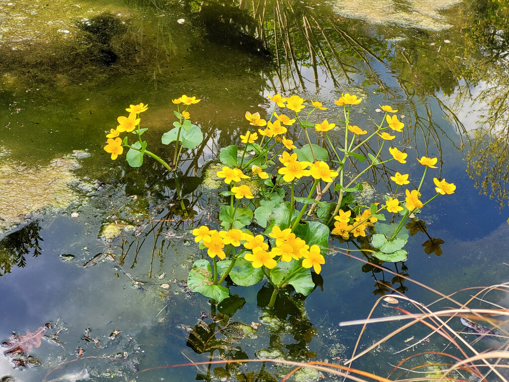 - Marsh marigold (Caltha palustris) – golden flowers in early spring